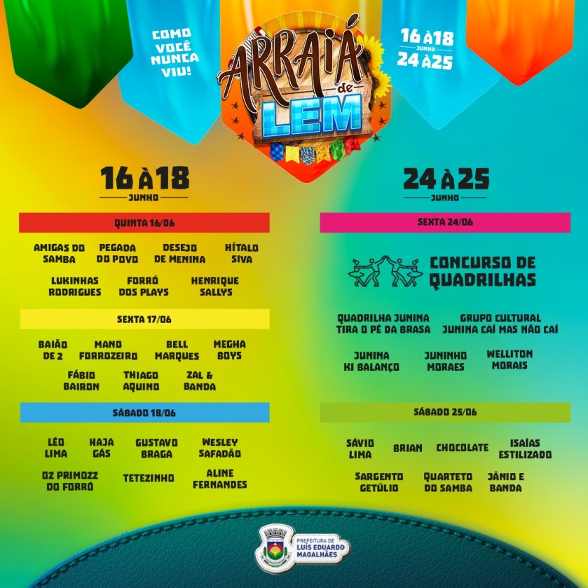 A Prefeitura de Luís Eduardo Magalhães divulgou nesta quinta-feira (09), a grade de atrações do Arraiá de LEM, maior São João do Oeste baiano, que inicia no próximo dia 16 de junho.