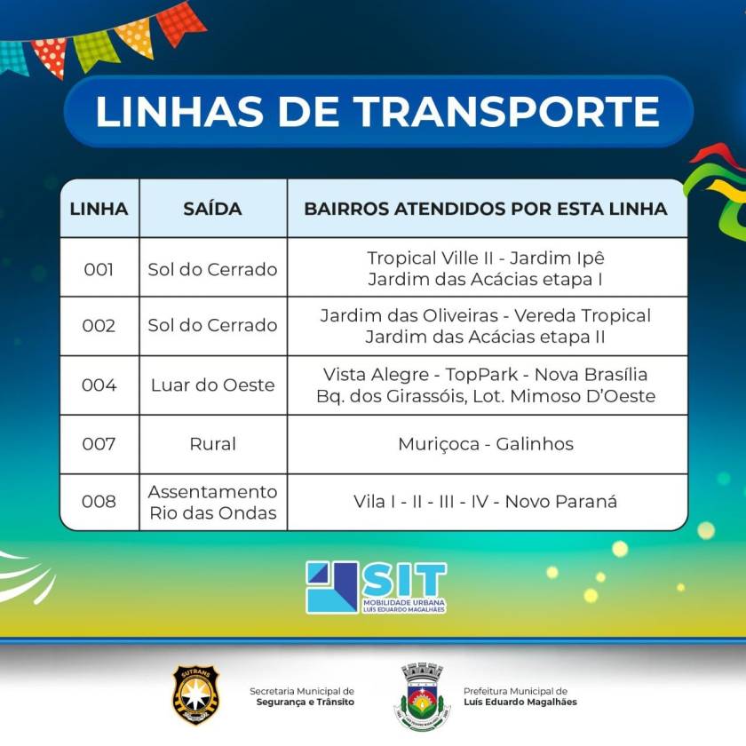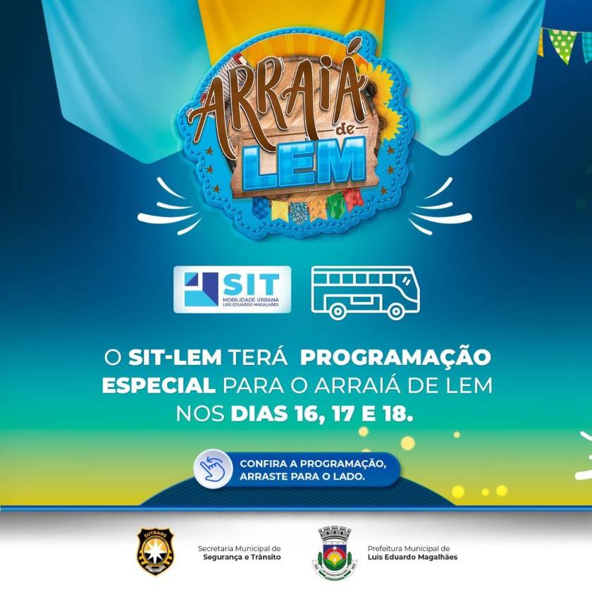 A Prefeitura de Luís Eduardo Magalhães, através da Secretaria Municipal de Segurança e Trânsito, vai disponibilizar horários especiais do transporte público para o Arraiá de LEM, que acontece no bairro Santa Cruz, nos dias 16, 17 e 18 de junho. A oferta tem como objetivo possibilitar a acessibilidade ao local da festa, aos moradores dos bairros mais distantes.