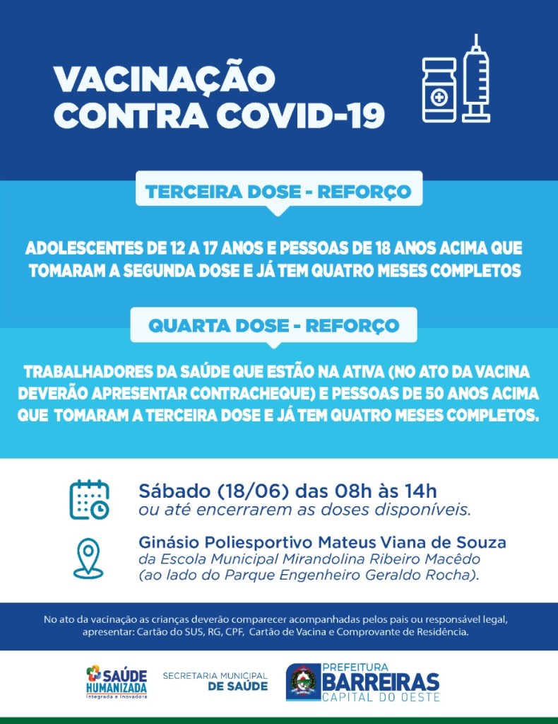 A Secretaria Municipal de Saúde de Luís Eduardo Magalhães informa que no município estão disponíveis todas as vacinas para a 1º, 2º, 3º e 4º dose.