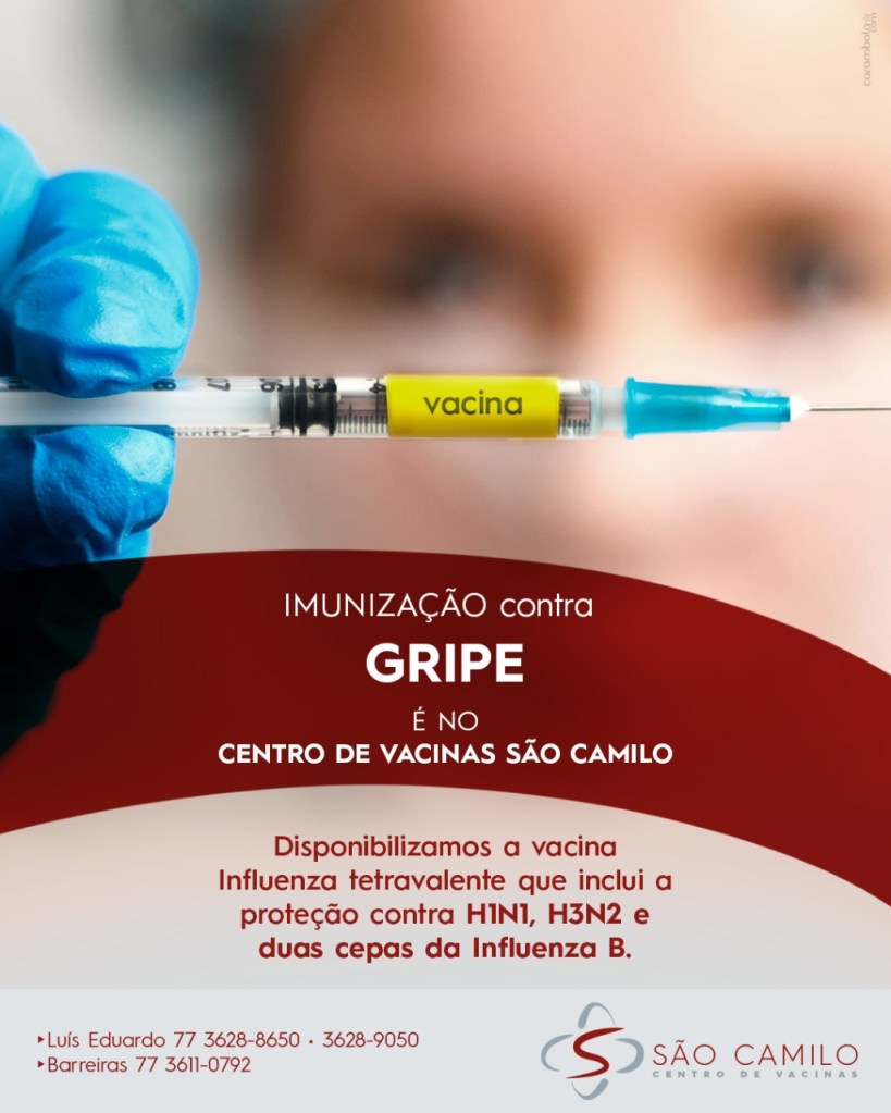 Vacina tetravalente que protege contra a Influenza H1N1, H3N2 e duas cepas da Influenza B é no Centro de Vacinas São Camilo. Em Luís Eduardo e Barreiras.