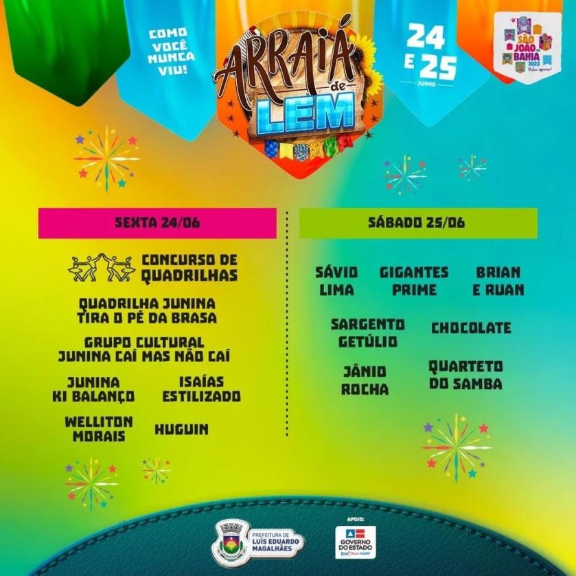 O Arraiá de LEM continua nesta sexta (24) e sábado (25), com atrações regionais e Quadrilhas Juninas em Luís Eduardo Magalhães. Os portões da Vila Junina, montada no bairro Santa Cruz, serão abertos a partir das 18h30 e as apresentações iniciam a partir das 20h no palco 1.