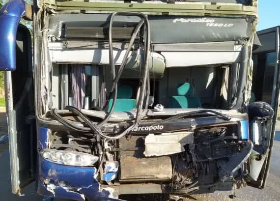 Ônibus bate na traseira de carreta e fere duas pessoas.