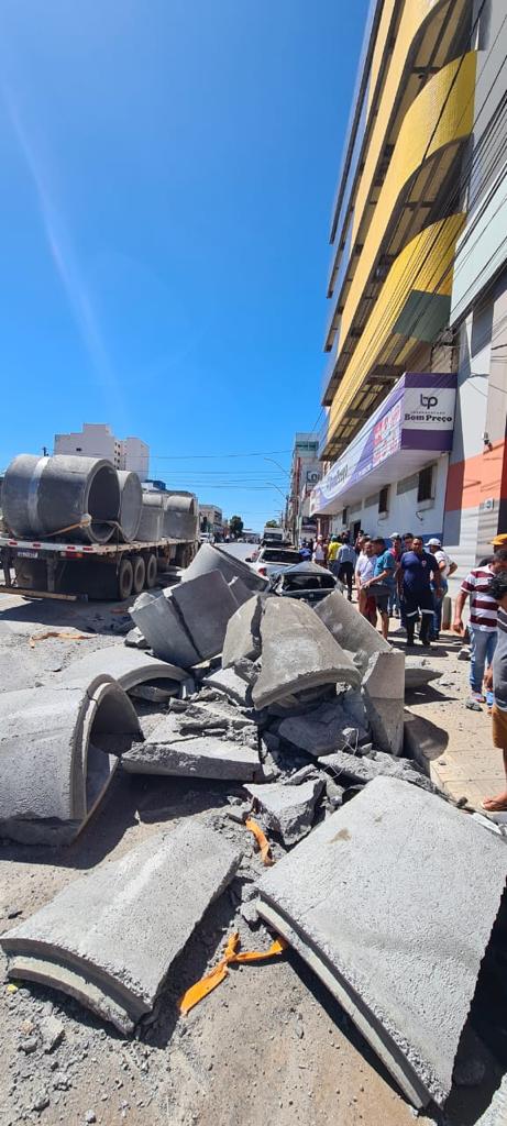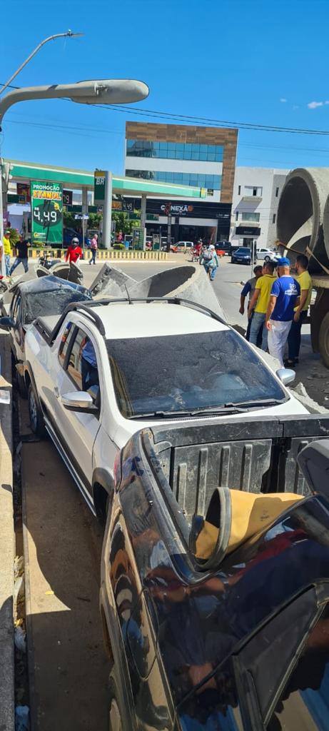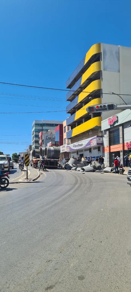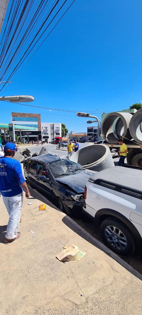 O acidente aconteceu agora, próximo ao meio dia. Uma carreta, carregada com manilhas, fez uma curva em velocidade, na zona urbana de Barreiras e despejou sobre carros estacionados muitos dos pesados artefatos de cimento.