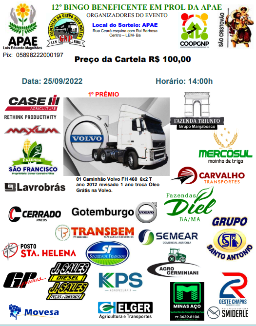 Contamos com seu apoio e gesto de solidariedade, adquirindo cartelas do bingo no valor de R$ 100,00 cada uma.