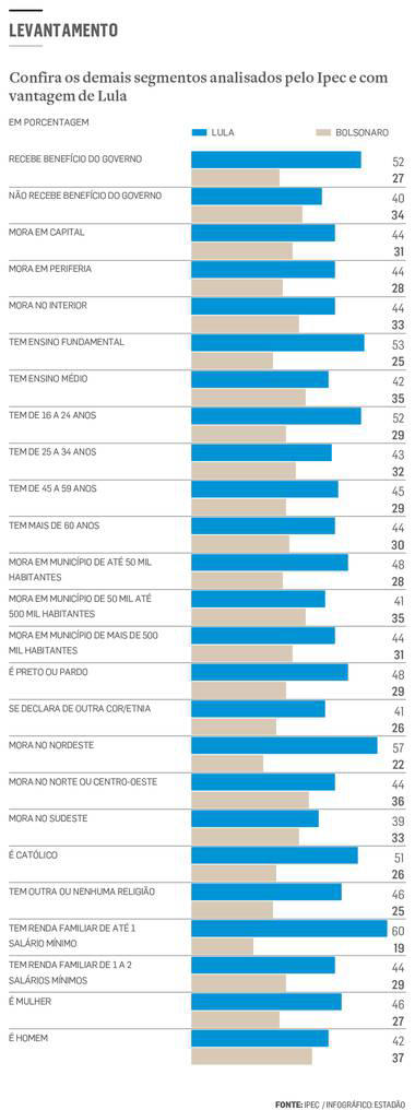 Ambos empatam entre quem tem ensino superior (Lula: 36%; Bolsonaro: 35%); na faixa etária de 35 a 44 anos (Lula: 39%; Bolsonaro: 38%); e entre pessoas que se declaram brancas (Lula: 39%; Bolsonaro: 35%). Exceto os recortes citados, o candidato do PT vence em todos os outros perfis. A leitura dos 32 estratos se dá no âmbito da pesquisa estimulada (quando é oferecida ao entrevistado uma lista com o nome dos candidatos) dentro dos diferentes perfis dos eleitores no que diz respeito a sexo, idade, raça/cor, escolaridade, renda familiar, religião, porte do município (número de habitantes), condição do munícipio (capital, interior ou periferia), região e benefícios do governo federal (se recebe).