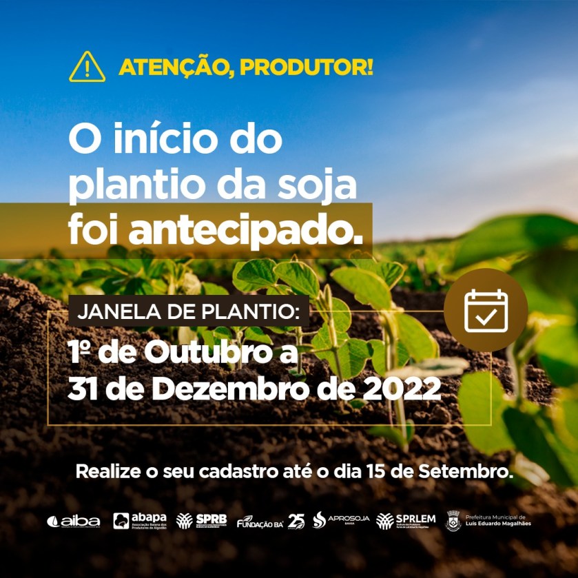 O prazo de cadastramento das áreas para o plantio antecipado da soja segue até (15) de setembro. De acordo com a Portaria N° 057 de 25 de julho de 2022, publicada pela Agência Estadual de Defesa Agropecuária da Bahia (Adab), que dispõe em caráter excepcional, o início da semeadura da soja ocorrerá a partir de 1º de outubro, safra 2022/2023, e a data de 31 de dezembro de 2022 para a conclusão desta etapa.