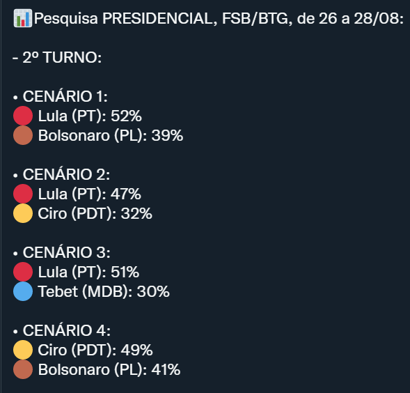 Pesquisa FSB/BTG, hoje: se o Candidato do Centrão não perdesse o segundo turno para Lula, perderia para Ciro.