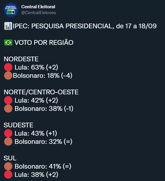 O Ipec entrevistou 3008 eleitores presencialmente, em 181 municípios, entre os dias 17 e 18 de setembro. A margem de erro é de 2% para mais ou para menos, com nível de confiança em 95%. A pesquisa foi registrada no Tribunal Superior Eleitoral (TSE) sob o número BR-00073/2022.