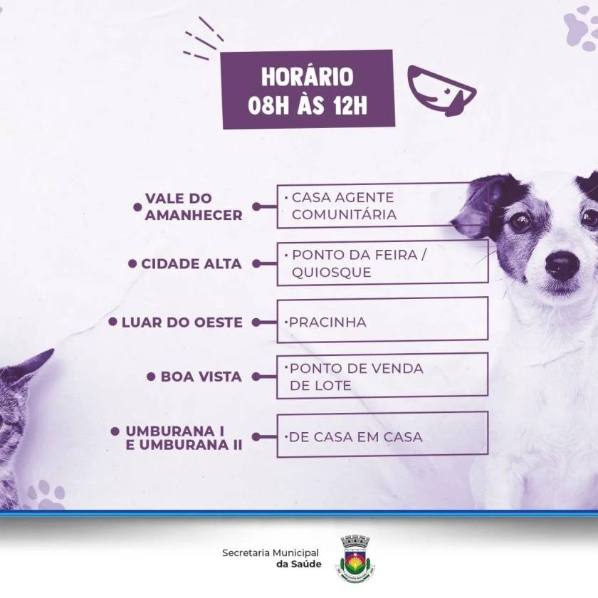 A Secretaria Municipal de Saúde de Luís Eduardo Magalhães continua com a vacinação antirrábica, neste sábado (24), das 8h às 12h, em seis localidades. A imunização é indicada para cães e gatos a partir dos 3 meses de idade.