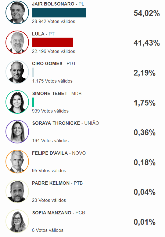 Em Luís Eduardo, Bolsonaro obteve 28.942 votos (54.02%), enquanto seu adversário, Lula da Silva, teve 22.196 sufrágios (41,43%). Simone Tebet, a musa do agronegócio, conseguiu 939 Votos válidos (1,75%).