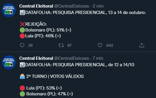 Nova pesquisa presidencial Datafolha, a 2ª a ser divulgada no âmbito do segundo turno das eleições, nesta sexta-feira (14), projeta vitória de Lula (PT) sobre Jair Bolsonaro (PL), assim como todos os levantamentos de outros institutos desta semana.