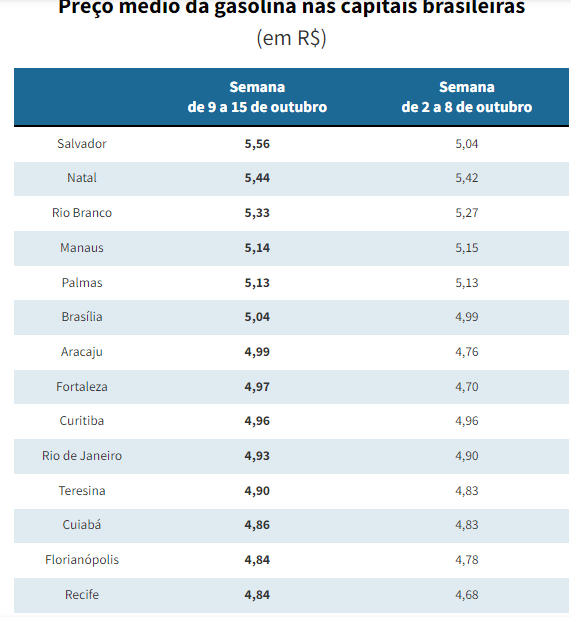 De 9 a 15 de outubro, o preço médio do litro do combustível em Salvador foi de R$ 5,56, segundo dados da Agência Nacional do Petróleo, Gás Natural e Biocombustíveis divulgados na segunda-feira (17) Macapá (AP) tem o menor preço médio, de R$ 4,48.