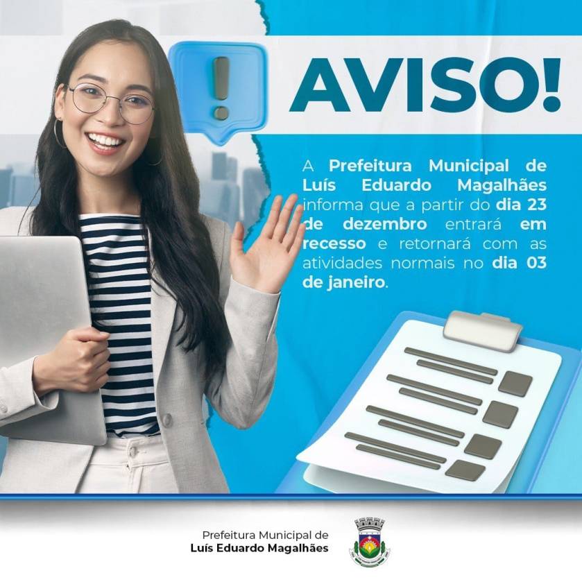 O recesso de final de ano da Prefeitura de Luís Eduardo Magalhães será compreendido entre os dias 23 de dezembro de 2022 e 02 de janeiro de 2023, de acordo com o decreto n° 1335 de 08 de dezembro. O último dia de expediente do ano será em 22 de dezembro de 2022 (quinta-feira) e o retorno das atividades ocorrerá em 03 de janeiro de 2023 (terça-feira). Os servidores públicos que estiverem no curso das férias nos dias do recesso, terão esses dias computados normalmente.