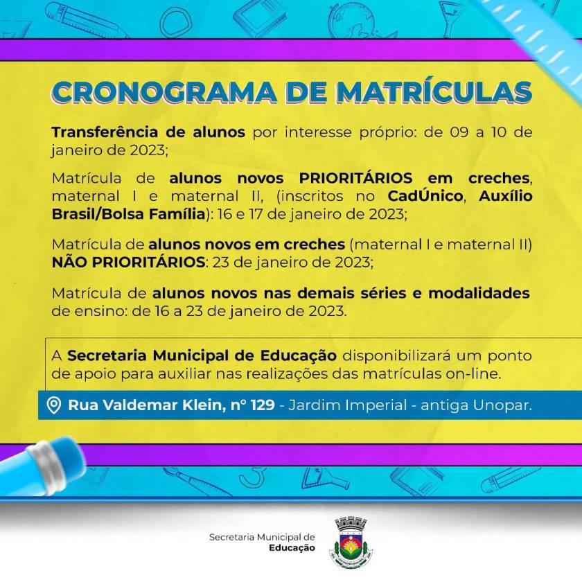 De 16 a 23 de janeiro- Matrícula de alunos novos nas demais séries e modalidades de ensino.