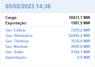 Em relação à geração por fontes não renováveis foi de 5.373 MW médio, a maior participação foi por fonte térmica a gás, com 45,0% (2.419 MW médio), seguidp de fonte nuclear com 28,3% (1.522 MW médio), carvão mineral com 12,8% (690 MW médio) e as demais fontes (térmica, GNL, óleo, gás/óleo, importação e reação exotérmica) com 13,8% (743 MW médio).