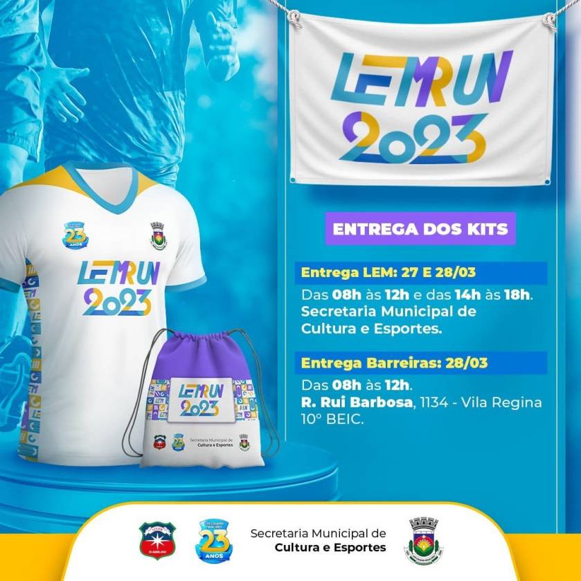Os kits para os participantes da corrida, serão entregues nos dias 27 e 28 de março, em Luís Eduardo Magalhães e Barreiras. Em LEM, nos dias 27 e 28 de março, das 8h às 12h e das 14h às 18h, na Secretaria Municipal de Cultura e Esportes, localizada na Rua Valdemar Klein, n° 129, Jardim Imperial.