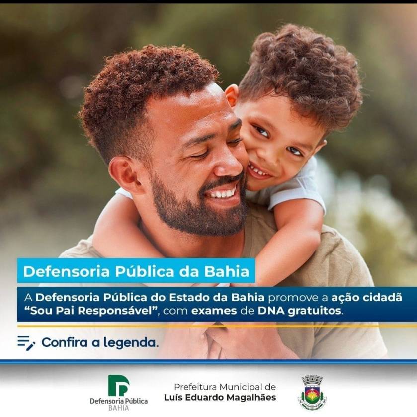 A Defensoria Pública do Estado da Bahia, com sede em Luís Eduardo Magalhães, realiza no dia 14 de abril, das 9h às 16h30, a Ação Cidadã – Sou Pai Responsável, com a oferta de exames gratuitos de DNA, orientações jurídicas, mediação e conciliação. Na sala da Defensoria, localizada na Câmara de Vereadores. A iniciativa conta com o apoio da Prefeitura do município.