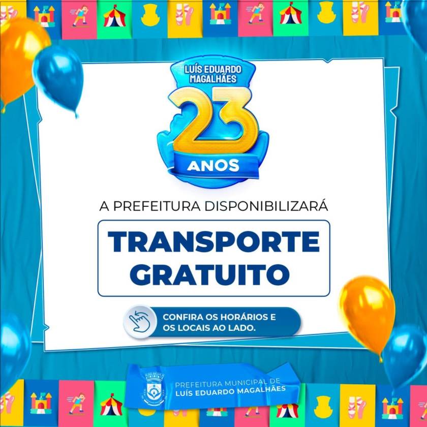 A Prefeitura de Luís Eduardo Magalhães vai disponibilizar transporte gratuito para o aniversário da cidade, que será comemorado amanhã (30), com uma programação toda especial, na Praça dos Três Poderes, no bairro Jardim Imperial.