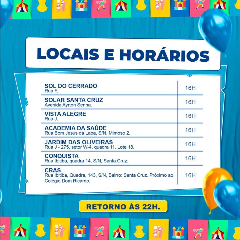 Os embarques acontecerão a partir das 16h, com retorno às 22h, nos Centros de Convivência e Fortalecimento de Vínculos, da Secretaria Municipal da Cidadania, distribuídos em sete bairros do município. Confira os horários e locais:
