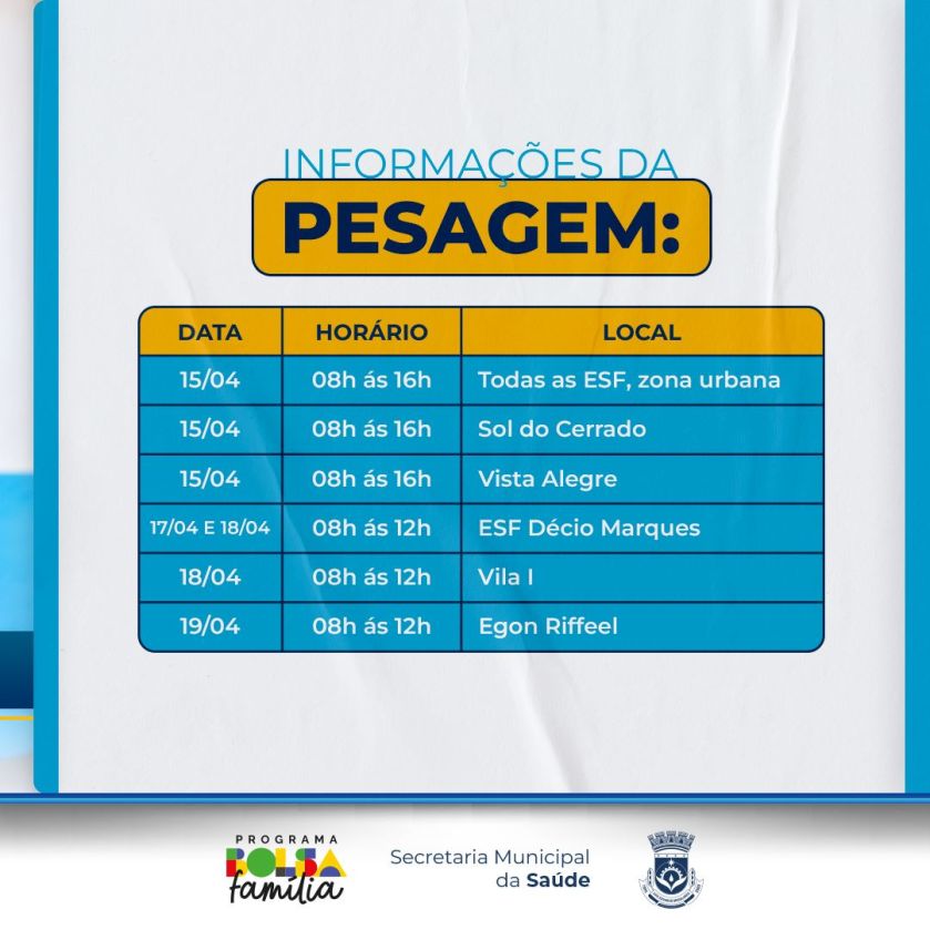 A Secretaria Municipal de Saúde de Luís Eduardo Magalhães, informa aos beneficiários do Programa Bolsa Família, que nos dias 15, 18 e 19 de abril, será realizada a pesagem para crianças menores de 7 anos, gestantes e mulheres de 14 a 44 anos. A ação acontece em parceria com a Secretaria da Cidadania.