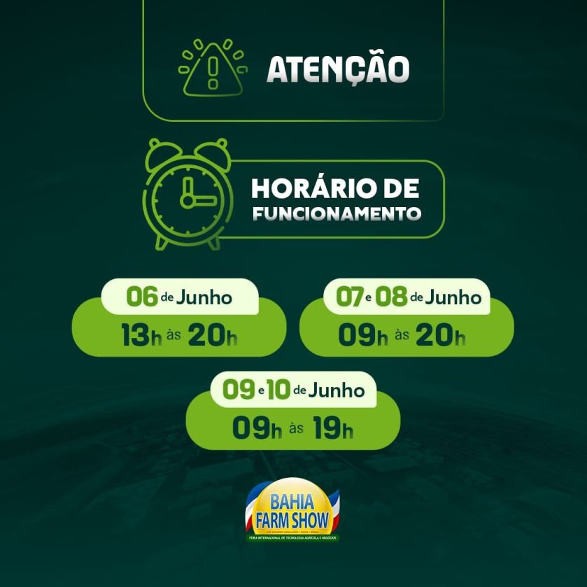 Confira o horário de funcionamento da Bahia Farm Show! Encontre o horário que melhor se adequa à sua agenda e aproveite ao máximo esta 17ª edição da feira!