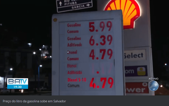 Em um posto da capital baiana a gasolina está sendo vendida por R$ 5,99 o litro nesta quinta. Na quarta (12), o valor variava entre R$ 5,64 e R$ 5,69.