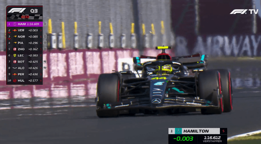 Após as primeiras voltas com pneus macios, Max Verstappen liderou o pelotão, à frente de Lewis Hamilton por uma pequena margem. No entanto, o holandês não conseguiu manter a primeira posição após sua segunda tentativa, já que não conseguiu melhorar seu tempo. Como resultado, Lewis Hamilton venceu a classificação com 1:16.609, apenas 0.003 segundos à frente do piloto da Red Bull. Lando Norris também teve uma chance de largar na primeira fila, mas terminou em 3º, à frente do companheiro de equipe Oscar Piastri.