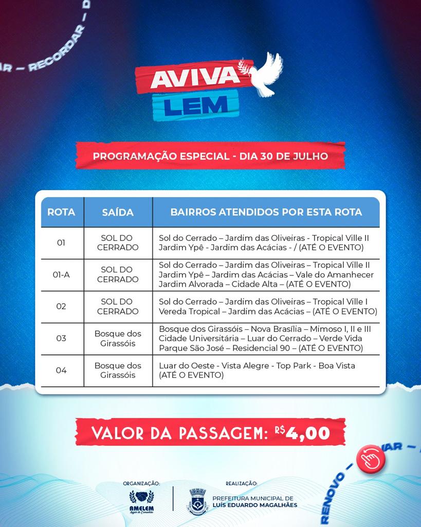 A Prefeitura de Luís Eduardo Magalhães, através da Secretaria Municipal de Segurança e Trânsito e da Superintendência de Trânsito e Transporte (SUTRANS), divulgou o esquema especial de transporte para o maior evento gospel da região Oeste da Bahia, o AVIVA LEM 2023, que será realizado de 29 de julho a 2 de agosto, no bairro Santa Cruz.