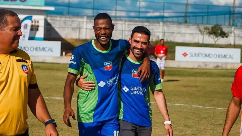 O prefeito Junior Marabá e o capitão da seleção de LEM, Marcelo Cardoso. Abaixo, da esquerda para a direita: o vice-prefeito de Barreiras, Emerson Cardoso, o prefeito de LEM, Junior Marabá, o secretário de Governo de LEM, Danilo Henrique e o prefeito de Barreiras, Zito Barbosa.