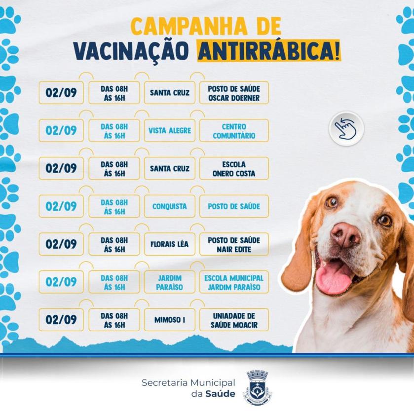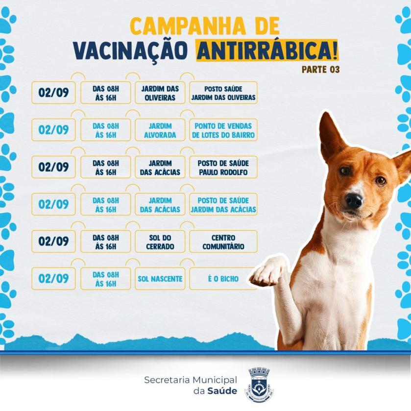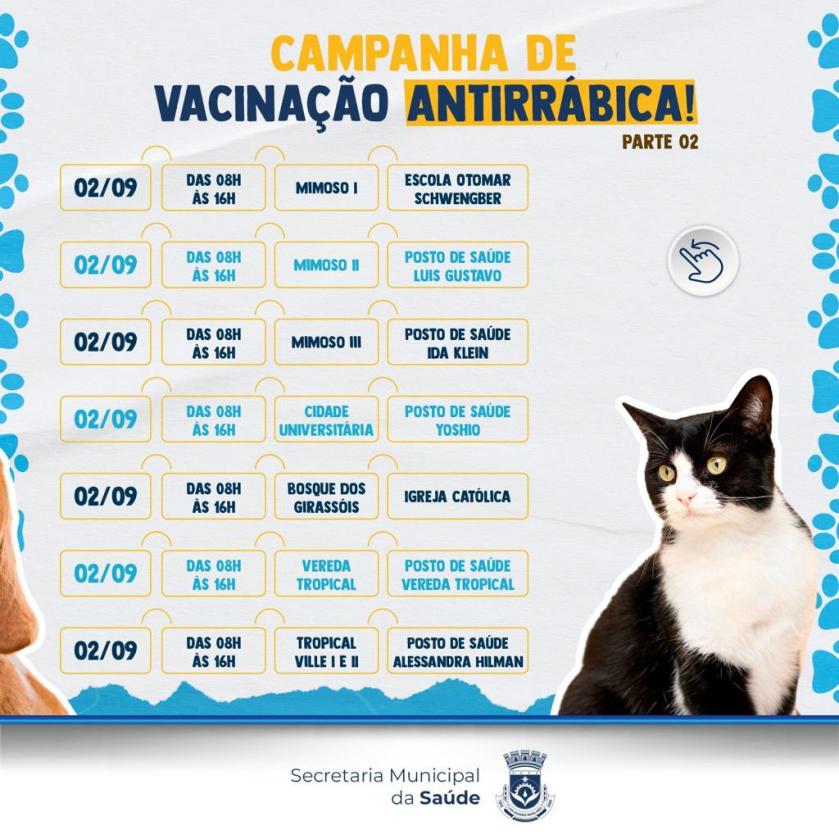 A Prefeitura de Luís Eduardo Magalhães, através da Secretaria Municipal de Saúde, informa que o Dia D da Vacinação Antirrábica Animal será realizado em 2 de setembro, das 8h às 16h, em 20 unidades da sede do município. A imunização é indicada para cães e gatos a partir dos 3 meses de idade, sendo recomendada uma dose ao ano.