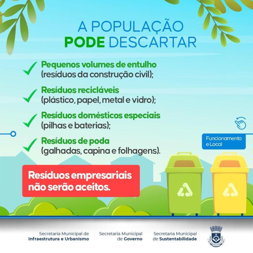 No local, a população pode realizar a entrega voluntária de pequenos volumes de entulho (resíduos da construção civil), resíduos recicláveis, como plástico, papel, metal e vidro, além de resíduos domésticos especiais, como pilhas e baterias, além de poda.