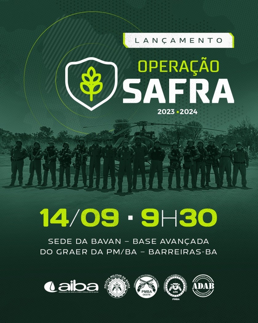 Em dez anos de serviços prestados à segurança e logística no campo de 11 municípios do Oeste baiano, a Operação Safra 2023/24 será lançada no dia (14) de setembro, às 09H30min, na sede da Base Avançada (Bavan) Grupamento Aéreo da Polícia Militar (Graer), em Barreiras, com presença de agricultores e autoridades políticas.