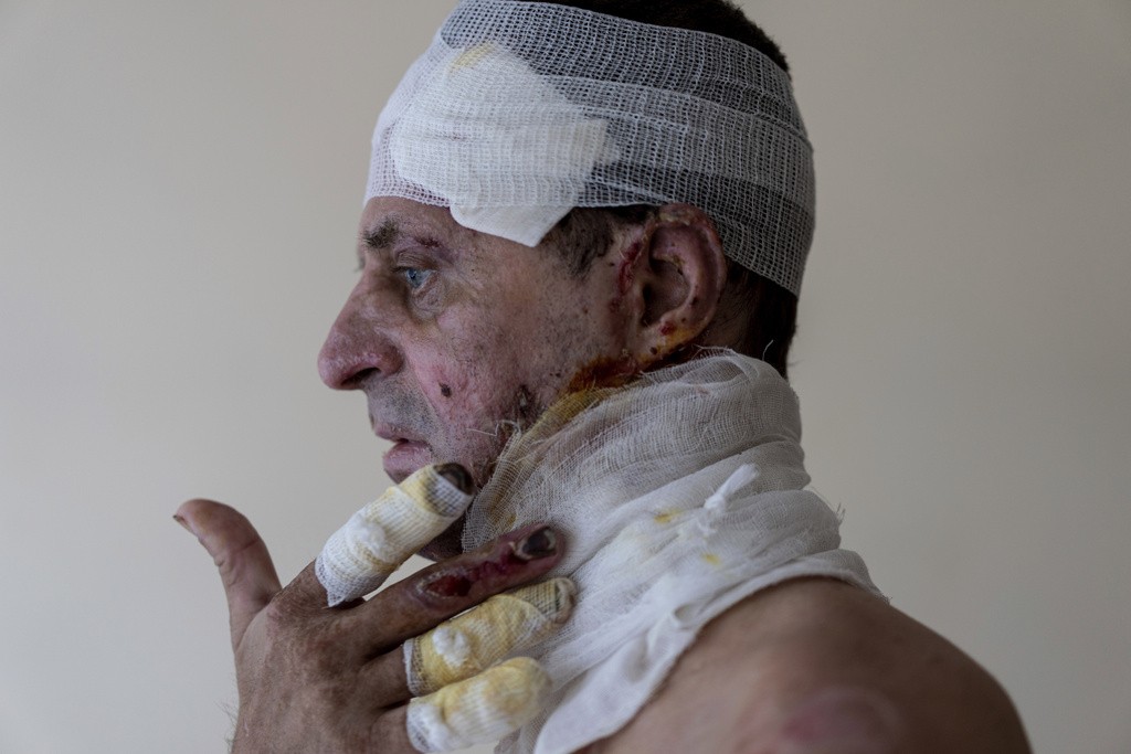 Mykhailo Yurchuk, um paraquedista, foi ferido nas primeiras semanas da guerra, perto da cidade de Izium. Seus companheiros o colocaram sobre uma escada e caminharam por uma hora até um lugar seguro. Na época, segundo ele, só conseguia pensar em encerrar tudo com uma granada. Um médico se recusou a sair do seu lado e segurou sua mão o tempo inteiro enquanto ele estava inconsciente.