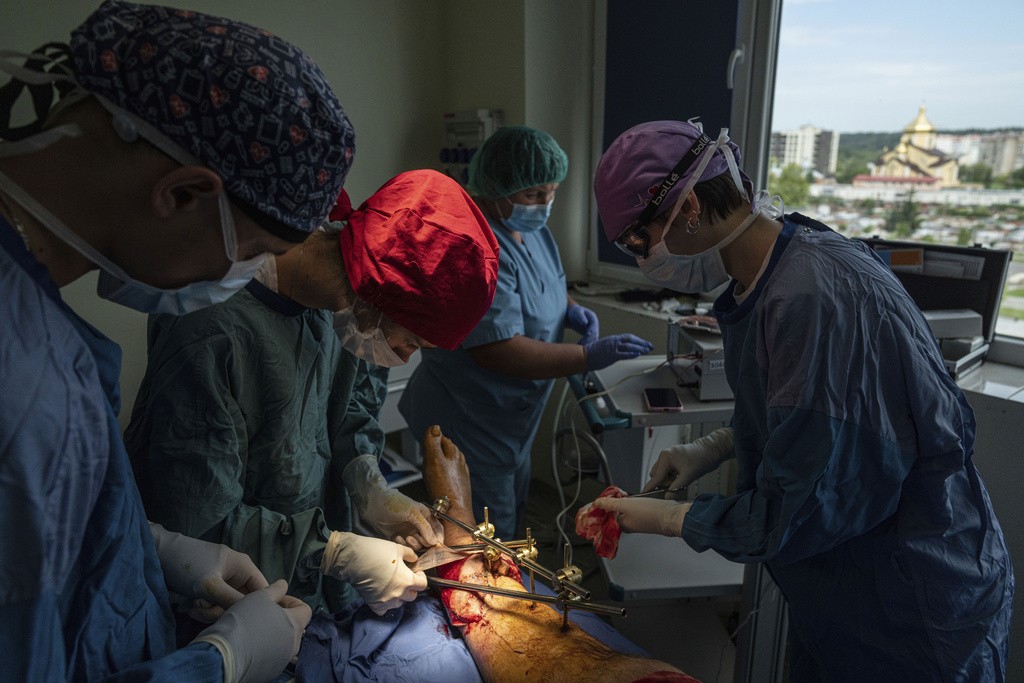 Cirurgiões enxertam pele no pé de um soldado ucraniano no Hospital São Pantaleão em Lviv, Ucrânia, terça-feira, 25 de julho de 2023 — Foto: Evgeniy Maloletka/AP