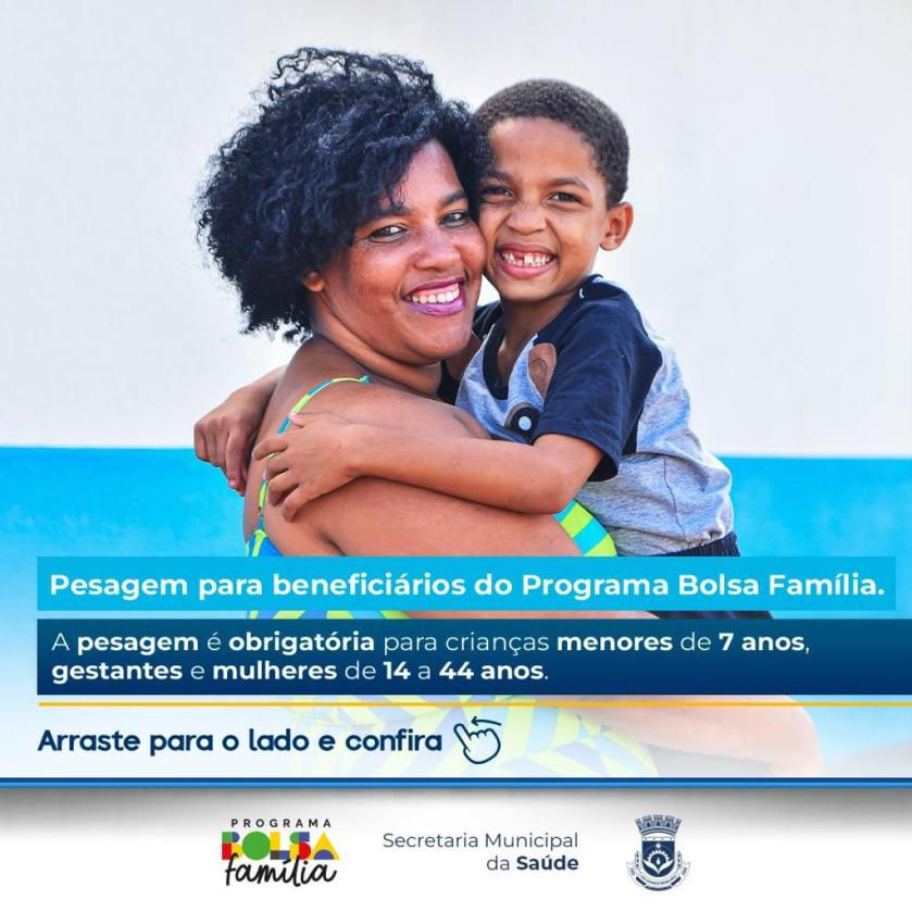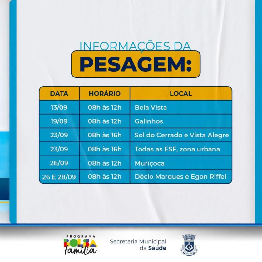 A Prefeitura de Luís Eduardo Magalhães, através da Secretaria Municipal de Saúde, convoca os beneficiários do programa Bolsa Família para que compareçam às unidades básicas de saúde para a pesagem. De 13 a 28 de setembro haverá uma intensificação dos trabalhos no município, com o objetivo de atender a demanda.