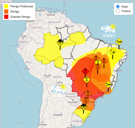Um outro alerta laranja foi criado pelo mesmo motivo, abrangendo uma faixa que passa por Tocantins, Goiás e cobre quase todo o estado de Minas Gerais. É provável que a Bahia comece a aparecer nos alertas dos próximos dias.