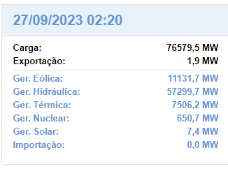 Devido a alta temperatura, a demanda de energia está alta até de madrugada. Veja a carga do sistema do ONS às 2h20m desta madrugada: