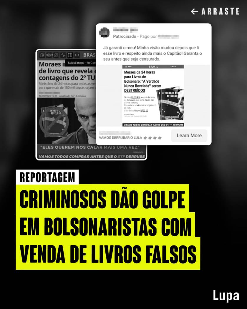 Posts com anúncios de supostos livros sobre Jair Bolsonaro (PL) estão sendo promovidos no Facebook e no Instagram para aplicar golpes com base em informações falsas. Ao menos dois títulos são usados no esquema: Jair Bolsonaro: A Verdade Nunca Revelada, que comprovaria fraude nas eleições de 2022, e Jair Bolsonaro: A Verdade Nunca Contada, descrito como livro oficial do ex-presidente. Ambos são vendidos por R$ 22,22, numa referência ao número usado pelo PL nas urnas. As obras, contudo, não existem.