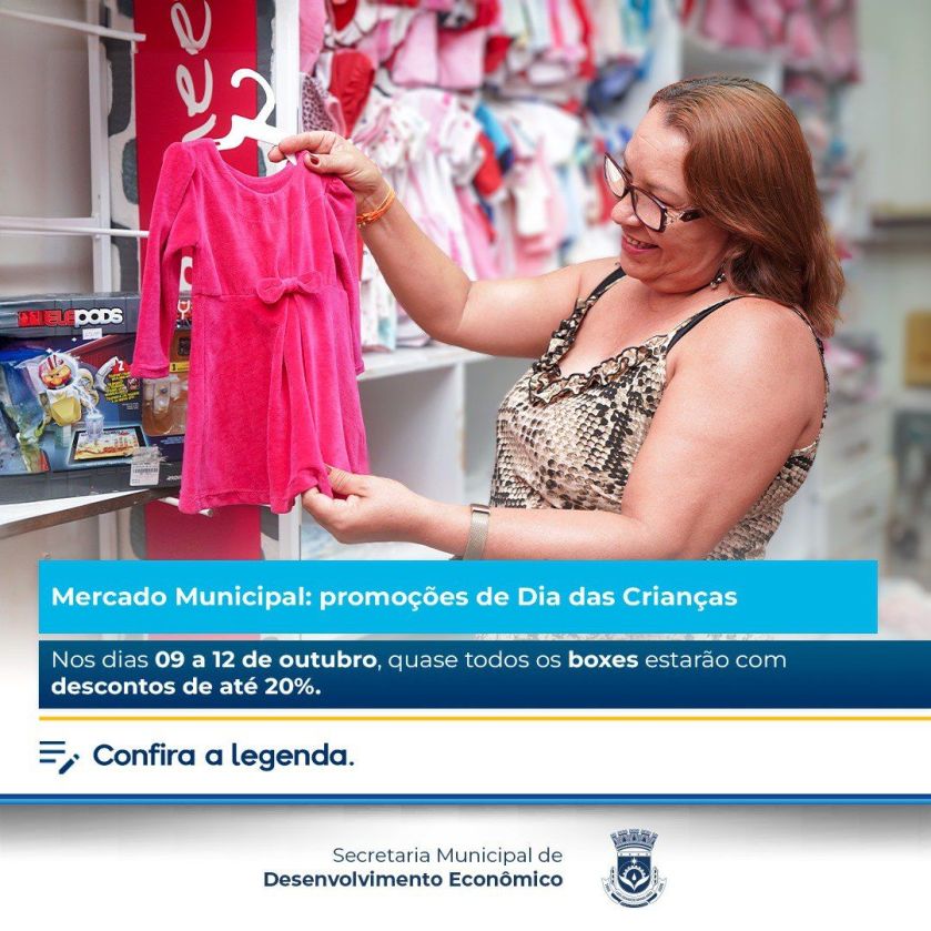 Em comemoração ao Feriado de Nossa Senhora Aparecida, Padroeira das Crianças, comemorado no dia 12 de outubro, todos os boxes do Mercado Municipal do bairro Santa Cruz, em Luís Eduardo Magalhães estão oferecendo descontos de até 20%, de 09 a 12 de outubro.