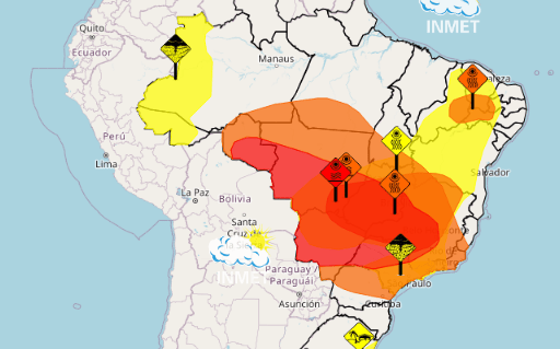 O aviso meteorológico abrange cinco estados em áreas do Centro-Oeste e do Sudeste do país e é válido até hoje.
