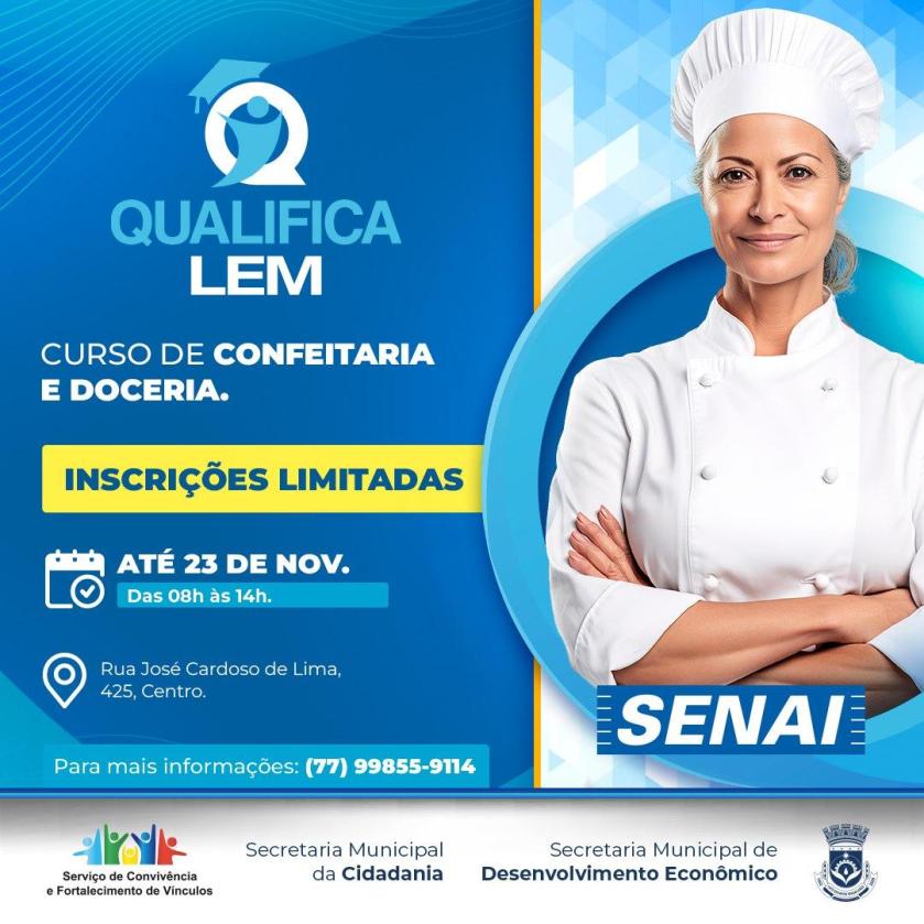 A Prefeitura de Luís Eduardo Magalhães, através da Secretaria de Desenvolvimento Econômico, informa que ainda há vagas para o curso de Confeitaria e Doceria, com inscrições abertas até a próxima quinta-feira, 23 de novembro.