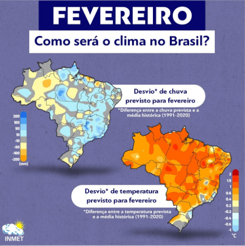 Foi divulgado nesta terça-feira (30, pelo Instituto Nacional de Meteorologia (Inmet), a previsão meteorológica par ao mês de fevereiro. Na segunda-feira (29), o órgão já havia divulgado a previsão para as próximas duas semanas.