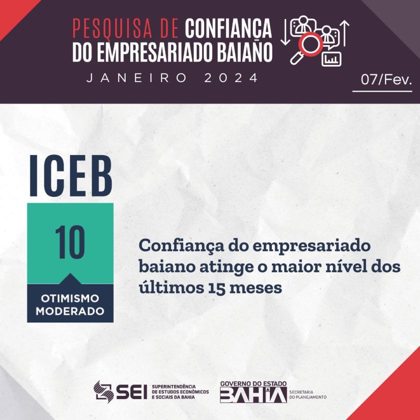 O Indicador de Confiança do Empresariado Baiano (ICEB), métrica calculada pela Superintendência de Estudos Econômicos e Sociais da Bahia (SEI) para monitorar as expectativas do setor produtivo do estado, marcou 10 pontos em janeiro numa escala que vai de -1.000 a 1.000 pontos – confirmando, assim, um cenário de Otimismo Moderado (intervalo acima de zero até 250 pontos) Trata-se da primeira pontuação positiva após 14 meses seguidos abaixo de zero. Além do mais, refere-se ao maior patamar desde outubro de 2022 (45 pontos).