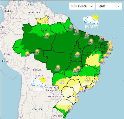 Chuvas intensas podem atingir várias regiões do país nas próximas 24 horas. O boletim do Instituto Nacional de Meteorologia (Inmet), divulgado na manhã desta terça-feira (12), indica previsão de chuva entre 20 e 30 milímetros por hora (mm/h) ou até 50 mm/dia e ventos que podem chegar à velocidade de 40 a 60 quilômetros por hora.