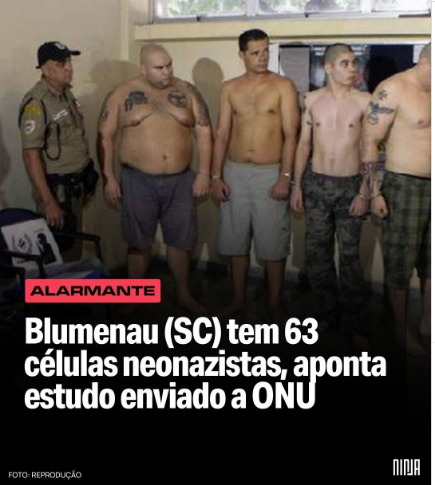 Além disso, o relatório apresenta um estudo realizado pela antropóloga e especialista no tema, Adriana Dias, revelando que Blumenau, cidade com 365 mil habitantes, abriga 63 células neonazistas, número que chama a atenção quando comparado aos 96 grupos identificados na capital paulista, com 12 milhões de moradores.