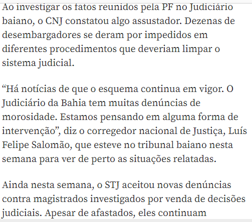 O Conselho Nacional de Justiça vai focar, nas próximas semanas, num grande escândalo da magistratura. Investigações da Polícia Federal e do próprio órgão revelam um quadro institucionalizado de corrupção ainda vigente no Judiciário da Bahia. Há possibilidade de intervenção no tribunal, algo extremamente grave para os padrões decisórios do CNJ.