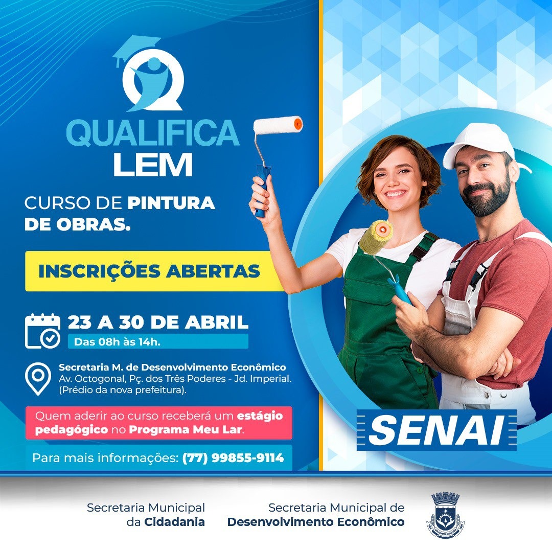 A Prefeitura de Luís Eduardo Magalhães, divulgou a abertura das inscrições para o curso gratuito de Pintura de Obras, que acontece de 23 a 30 de abril. A iniciativa faz parte do Programa Qualifica LEM, uma parceria entre a Secretaria Municipal de Desenvolvimento Econômico e o Senai.