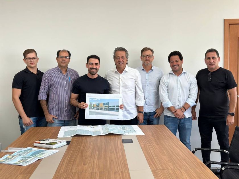O projeto da nova concessionária. Abaixo, o prefeito Junior Marabá e representantes do Grupo Primavia