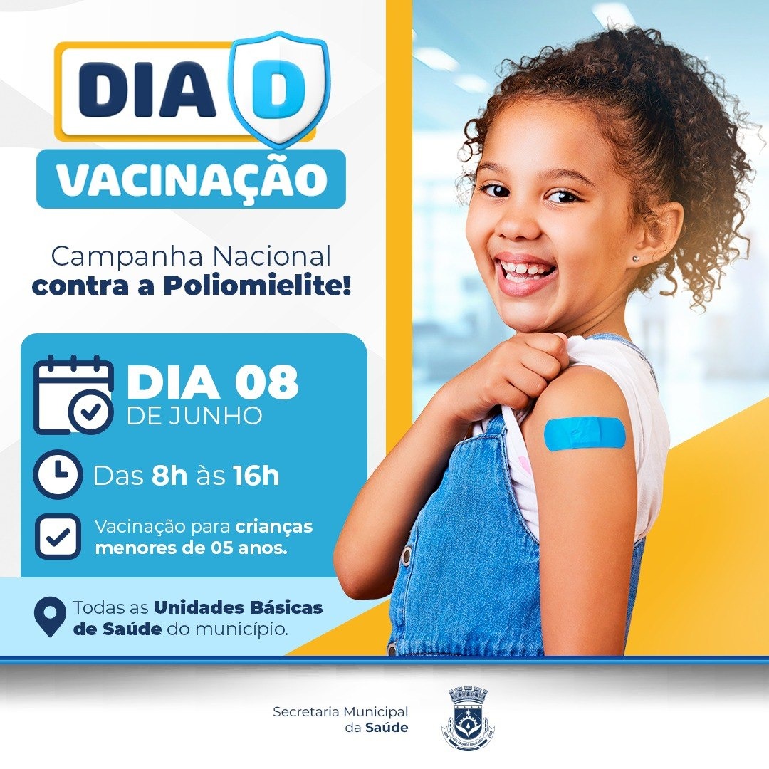 O Dia D de vacinação contra a Poliomielite, voltada para crianças de 01 a menores de 05 anos de idade, acontece amanhã, dia 08 de junho, das 8h às 16h, em todas as unidades básicas de saúde de Luís Eduardo Magalhães.