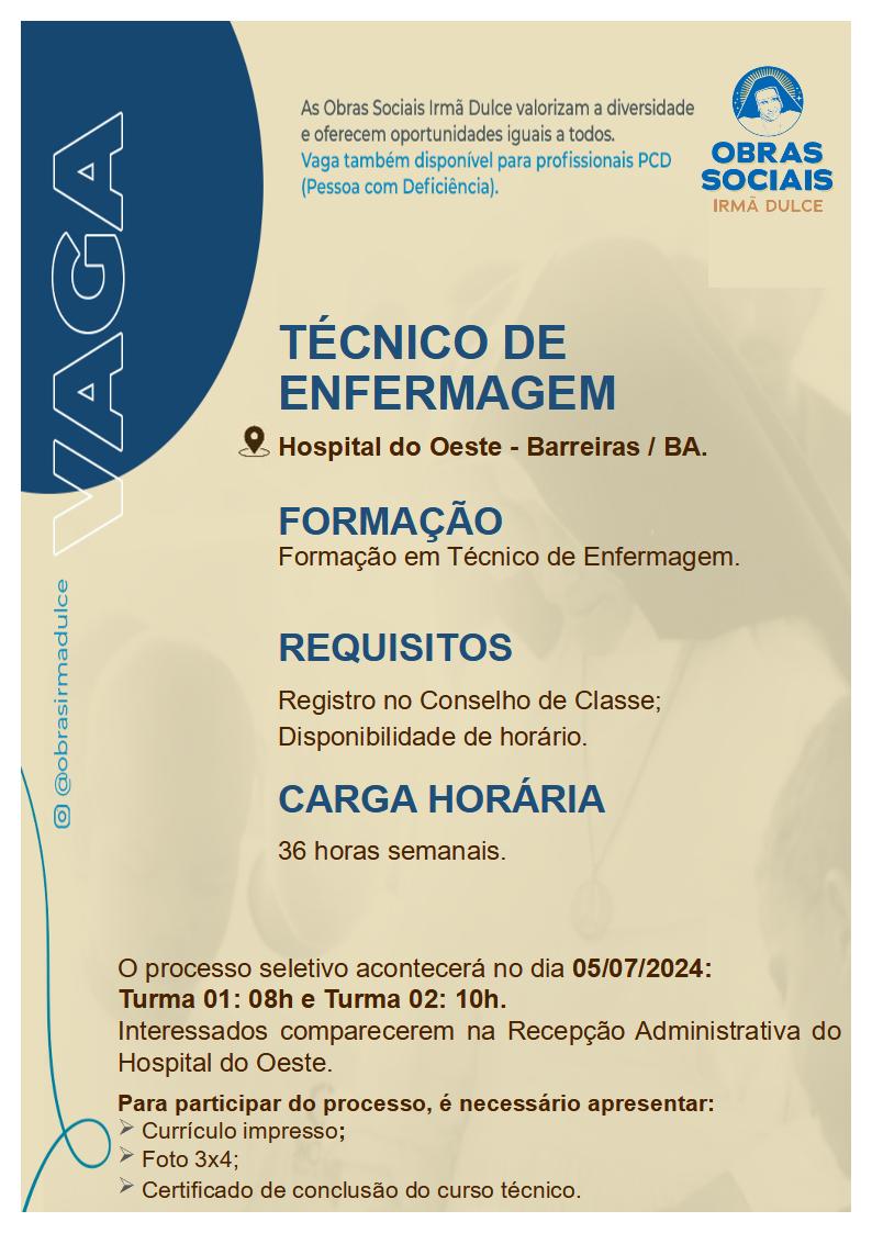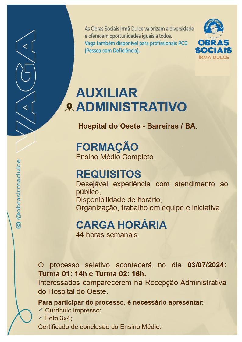 O Hospital do Oeste (HO), unidade vinculada ao governo estadual e administrada pelas Obras Sociais Irmã Dulce (OSID) no município de Barreiras divulga vagas de emprego para contratação imediata e cadastro de reserva. Os cargos são para auxiliar administrativo, operador de máquinas, técnico em enfermagem e técnico em laboratório. Todas vagas oferecem oportunidades para Pessoas Com Deficiência (PCD).